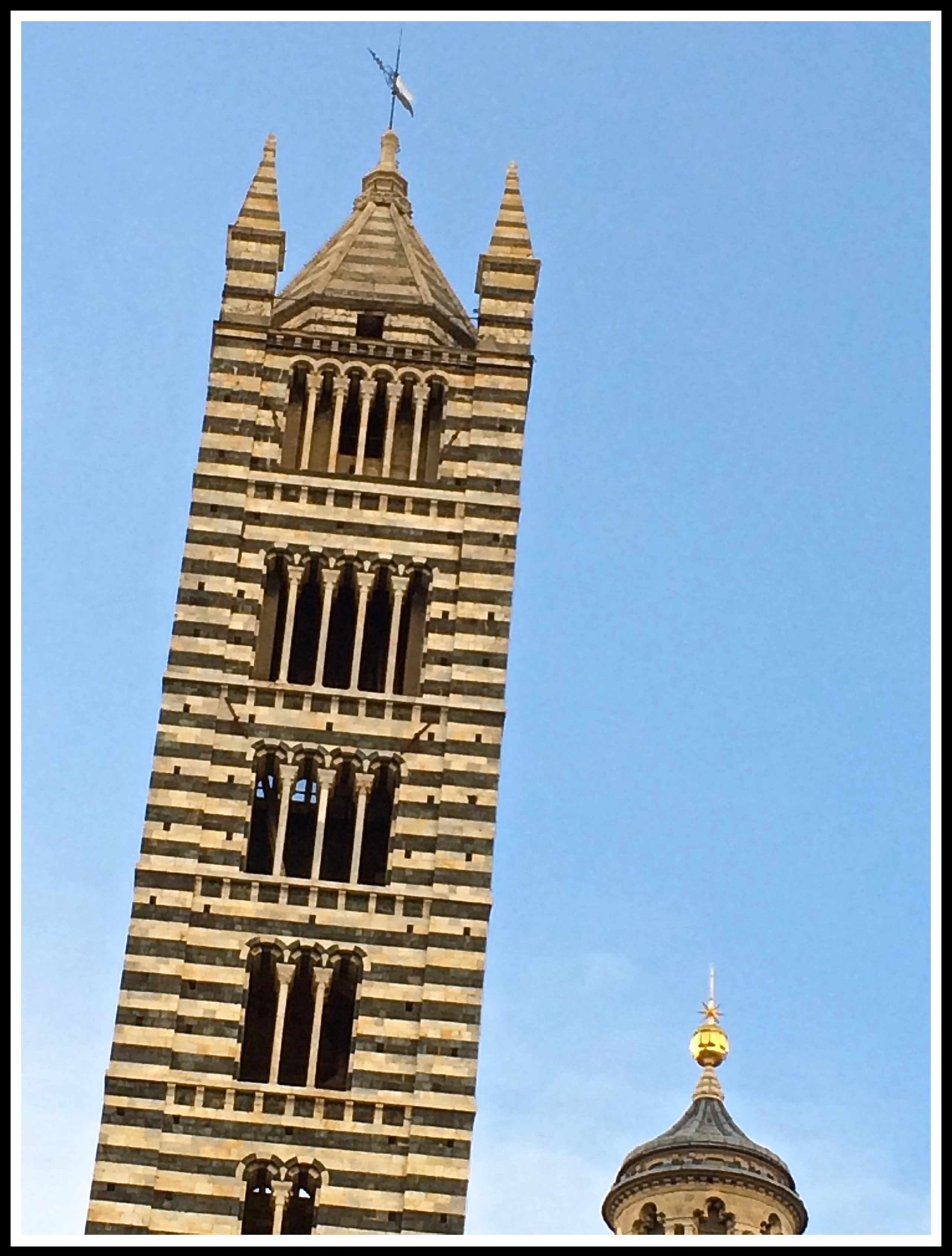 The cathedral itself was originally designed and completed between 1215 and 1263 on the site of an earlier structure. It has the form of a Latin cross with a slightly projecting transept, a dome and a bell tower. The dome rises from a hexagonal base with supporting columns. The lantern atop the dome was added by Gian Lorenzo Bernini. The nave is separated from the two aisles by semicircular arches. The exterior and interior are constructed of white and greenish-black marble in alternating stripes, with addition of red marble on the façade. Black and white are the symbolic colors of Siena, etiologically linked to black and white horses of the legendary city’s founders, Senius and Aschius.