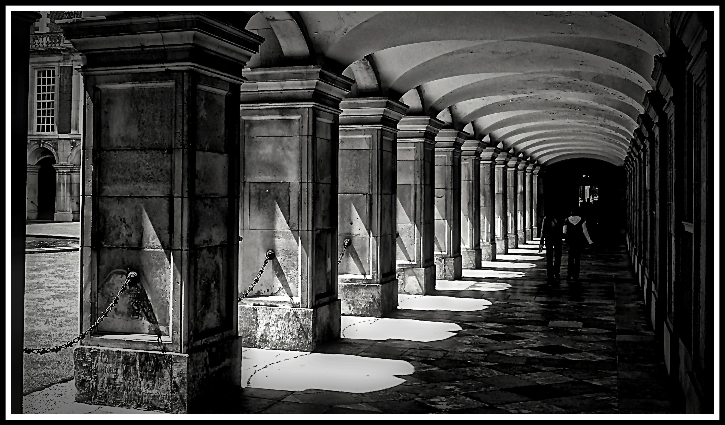 One of my very first photos taken as blind photographer. Taken with a Fugi F10 camera. I was visiting Hampton Court Palace and was struck by the contrast between the heat in the sunny parts and the cool in the the shadows when walking down this corridor. I wanted to reflect this in the patterns made by sunlight playing though the arches. I used black and white in this image to capture this feeling.