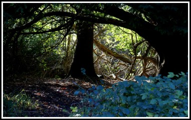 A photo looking down the hill through the trees with some beautiful purple flowes at the front. The trees also look like a cats eye to me. 🙂