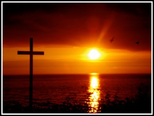 A sunset with streaking light down the centre, a cross on the left and a couple of birds on the right. Taken from a cliff walk.