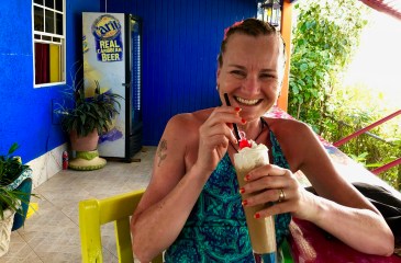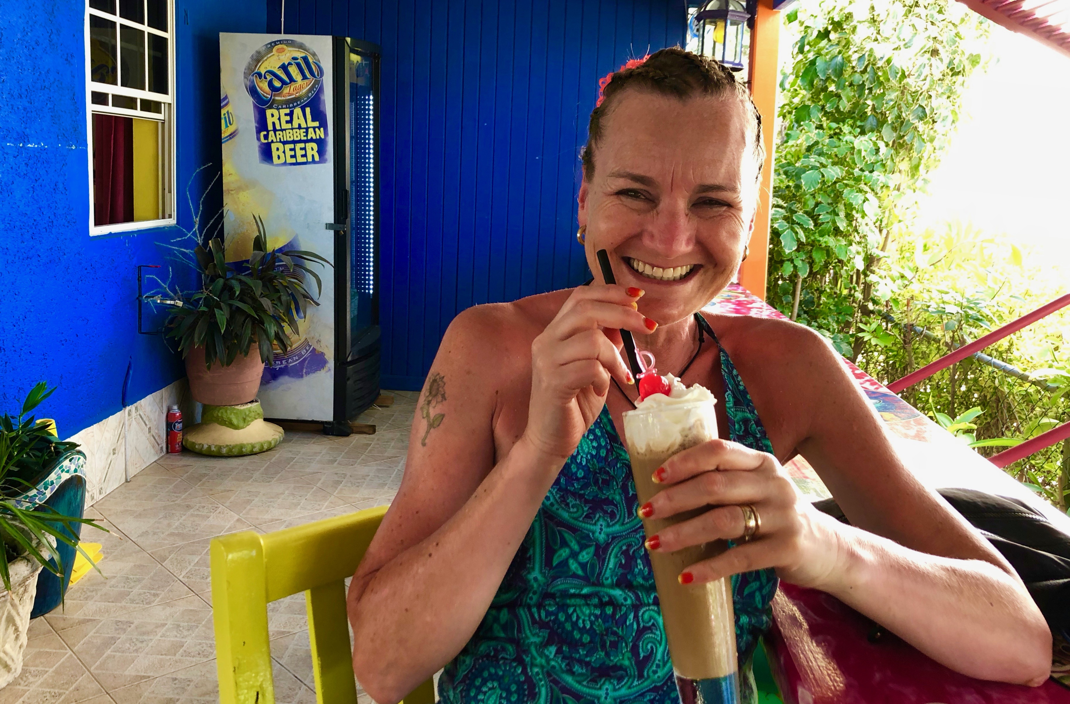 Sarah drinking a sugar free iced coffee in Sharkey’s on the Gap in Barbados, April 2018